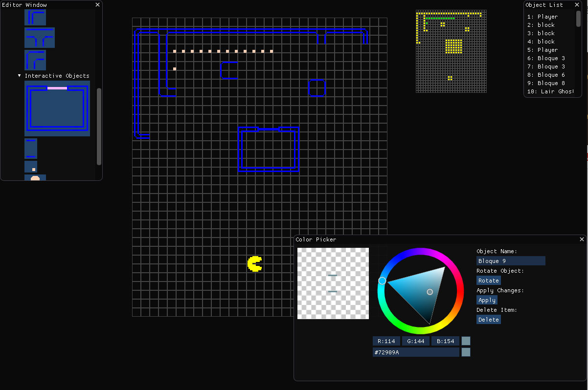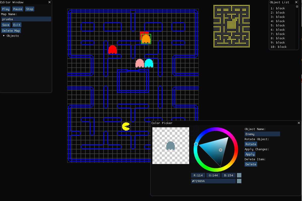 The user has at his disposal all the pieces of the Pacman map so he can create his own mazes, he can add walls, corners, enemies, points, everything necessary to create a good Pacman level. When the user creates a level it is saved in the database.
