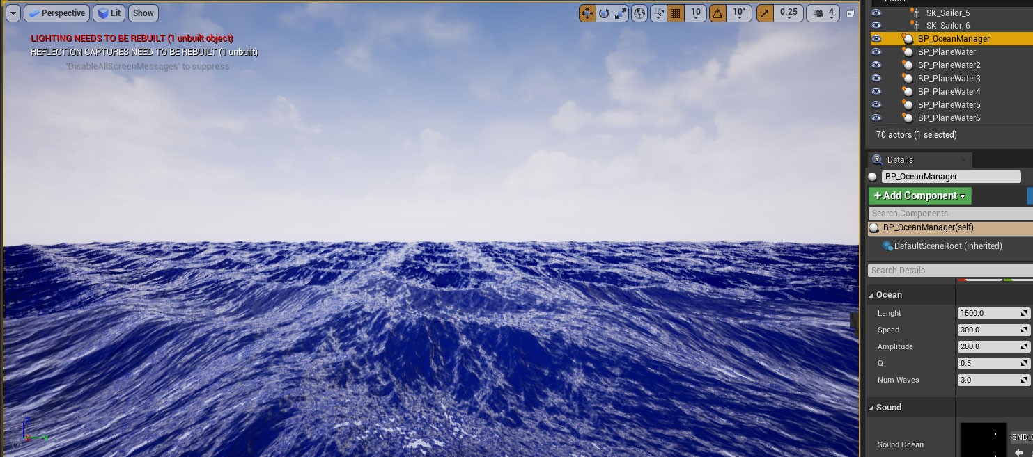 This project is a simulation of a sea through the Gerstner Waves formula, this formula is applied to each vertex of the mesh so that to simulate the sea. It is implemented in Unreal Engine 4 with materials and C++ functionality to simulate the flotation through physics. The waves of the sea can be modified in real time by deciding the height, the distance, the curvature of the wave peak, the speed.