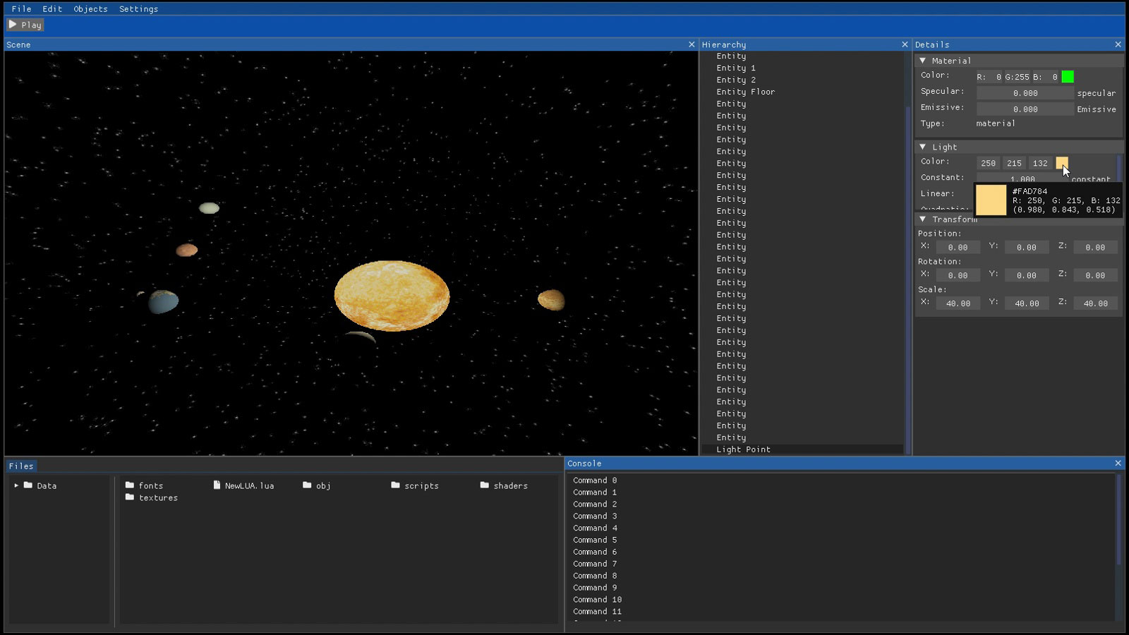 OMNIA allows the user to change the values of the different entities in the editor, the editor is made of Imgui. Some of the values that can be modified include position, rotation, scale, in addition to the values of each material such as the color of the objects, their specularity or whether they are emissive.