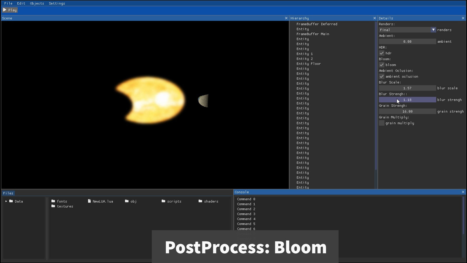 Finally, as an example, an emissive value has been implemented to make an object shine without being affected by the lights. To do this we have added an emissive variable to the objects and these with that value fill the texture of brightness, in order to apply the bloom effect.